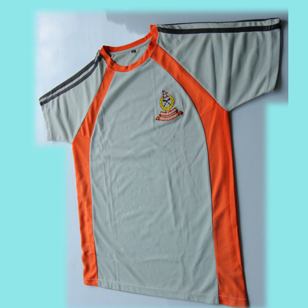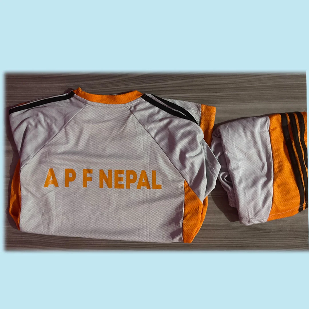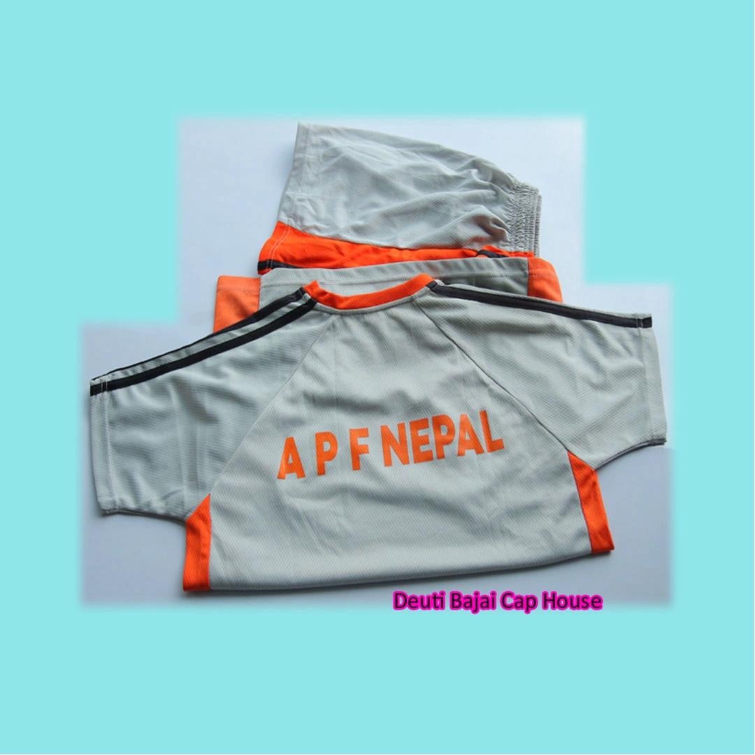 आधा टिसर्ट जसको अगाडिमा APF लोगो धागो (thread embroidery) मार्फत बनेको